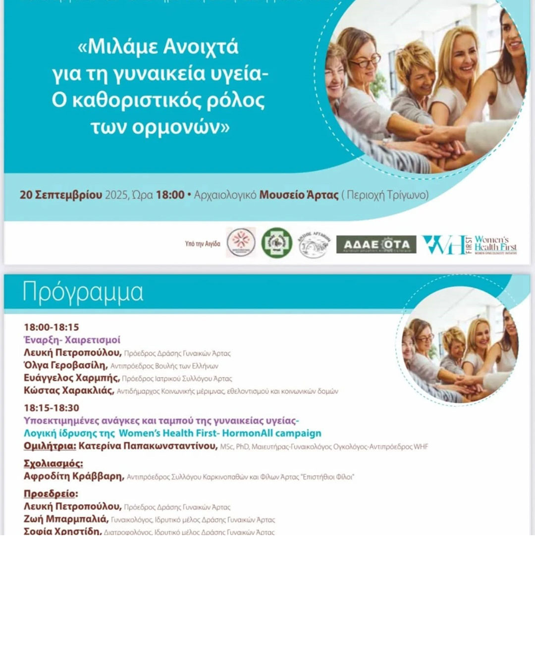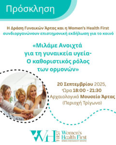 Με συγκινητική επιτυχία και προσέλευση κόσμου πραγματοποιήθηκε στην Άρτα στις 20/09/2025 η επιστημονική εκδήλωση της Women’s Health First σε συνεργασία με τον σύλλογο “Δράση Γυναικών Άρτας” στον φιλόξενο χώρο του Αρχαιολογικού Μουσείου. Θέμα της εκδήλωσης: «Μιλάμε Ανοιχτά για τη Γυναικεία Υγεία – Ο Καθοριστικός Ρόλος των Ορμονών». Από την Women’s Health First, συμμετείχαν τα ιδρυτικά μέλη Katerina Nik Papakonstantinou και Vassiliki Papagianni , καθώς και μέλη του Consultant Board #FaniGrozou και #vassosiafaka. Την εκδήλωση χαιρέτισε η αντιπρόεδρος της Βουλής Όλγα Γεροβασίλη και εκπρόσωποι της τοπικής αυτοδιοίκησης και του Ιατρικού Συλλόγου Άρτας. Εξαιρετικές εισηγήσεις από καταξιωμένους επιστήμονες καθήλωσαν το κοινό και μίλησαν ανοιχτά για τις υποεκτιμημένες ανάγκες της γυναικείας υγείας, τα διαχρονικά ταμπού και τον ρόλο των ορμονών. Η εκδήλωση ολοκληρώθηκε με μια διαδραστική παράσταση από την ομάδα θεάτρου playback Ψ Playback Ψ / Psi, που άγγιξε τις ψυχές όλων..